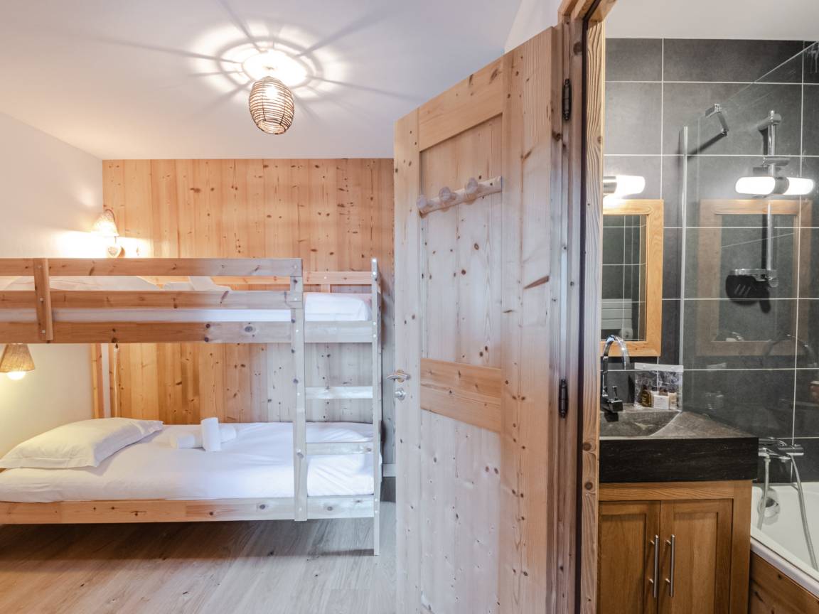Chambre famille : lit double 140×190 + coin enfants avec lits superposés et salle de bain privée