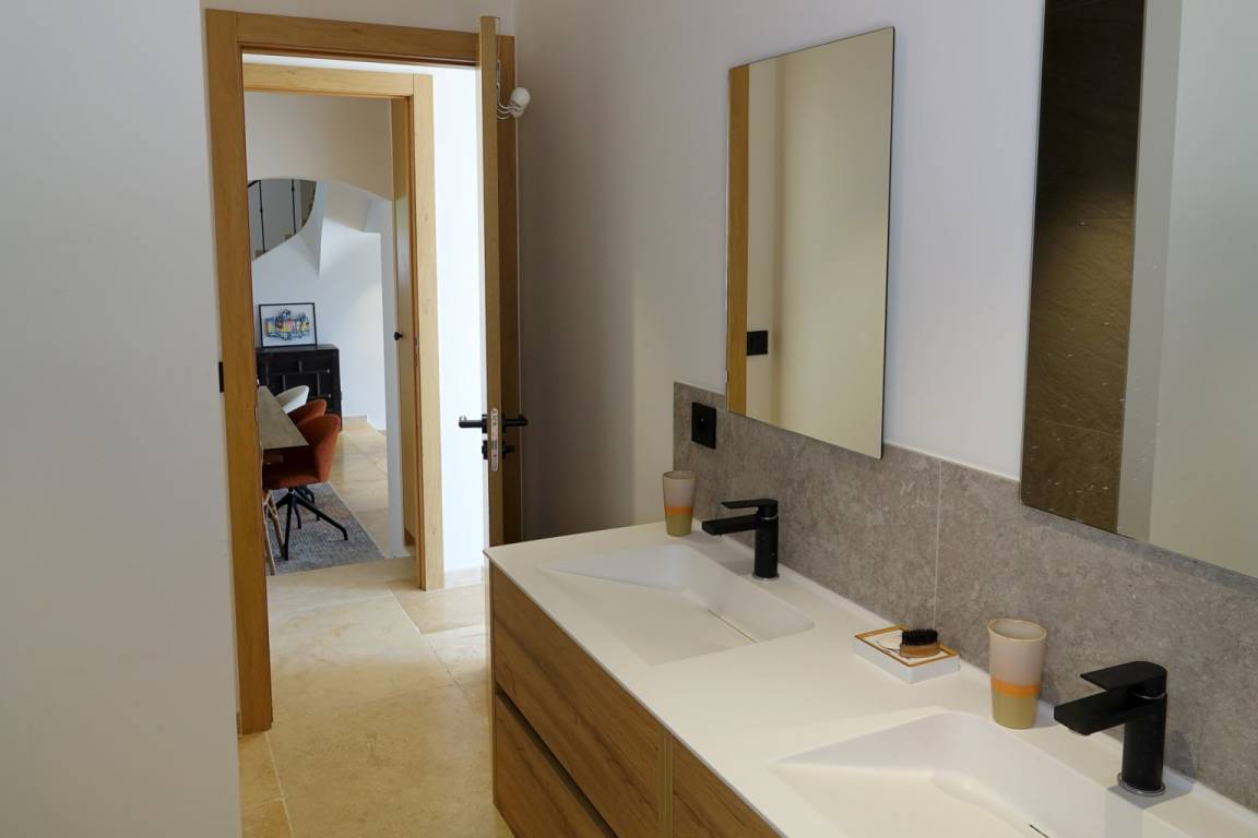 La maison dispose de trois chambres confortables, chacune équipée d’un lit double, offrant à chacun son espace de repos et d’intimité. Les trois salles de bain, modernes et fonctionnelles, apportent un vrai confort au quotidien, notamment lors des séjours en famille.