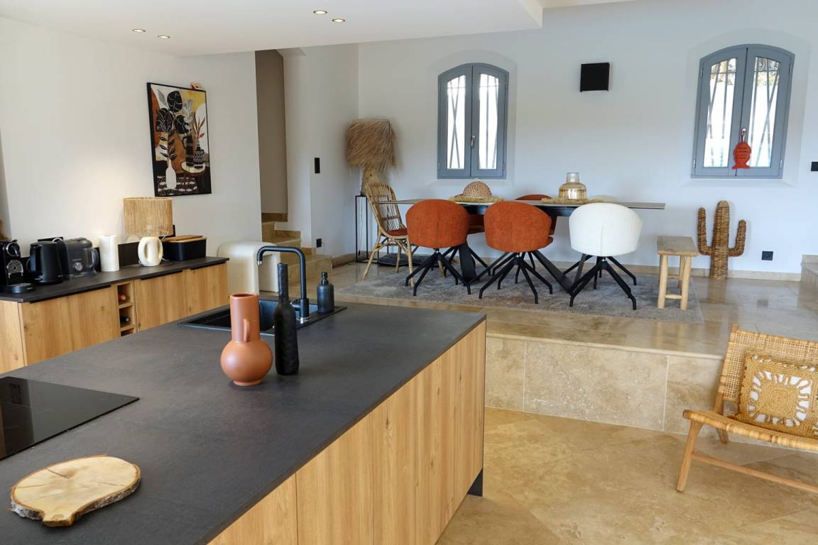 À l’extérieur, la terrasse devient un lieu central : petit-déjeuner au soleil, déjeuner à l’ombre, apéritif en fin de journée… Le jardin et le terrain de pétanque prolongent l’expérience, dans une ambiance typiquement méditerranéenne, calme et verdoyante.
