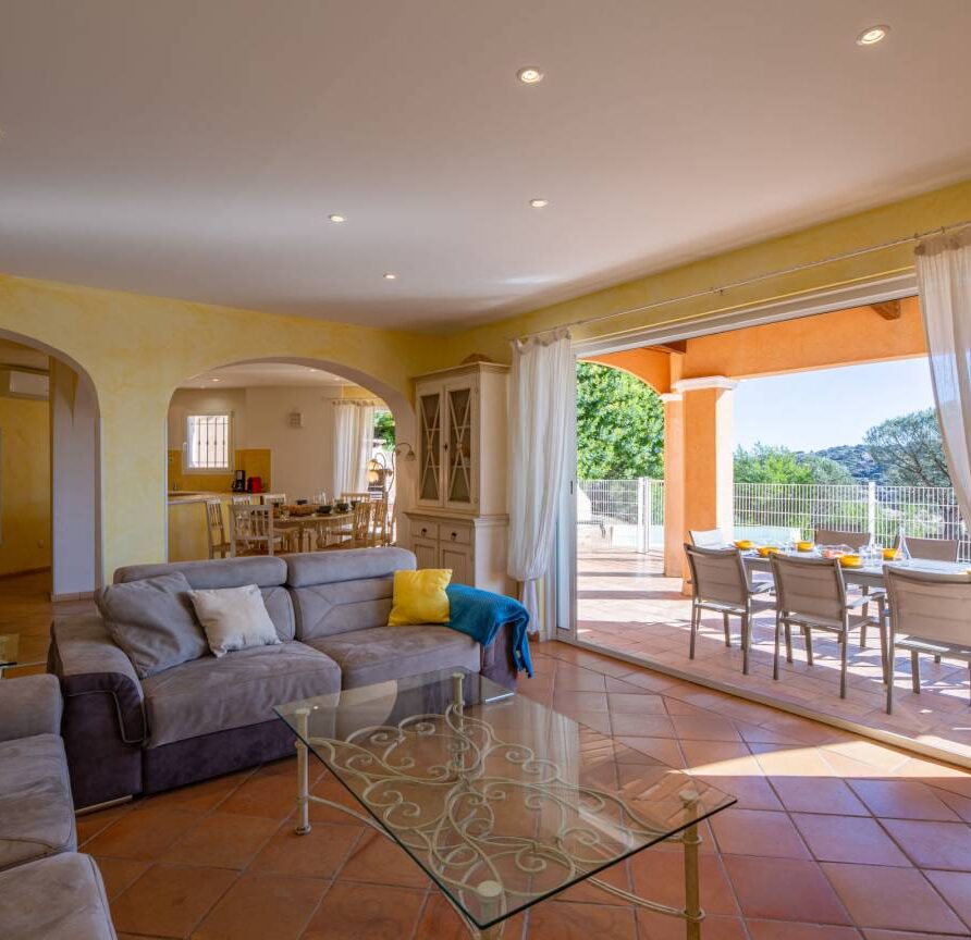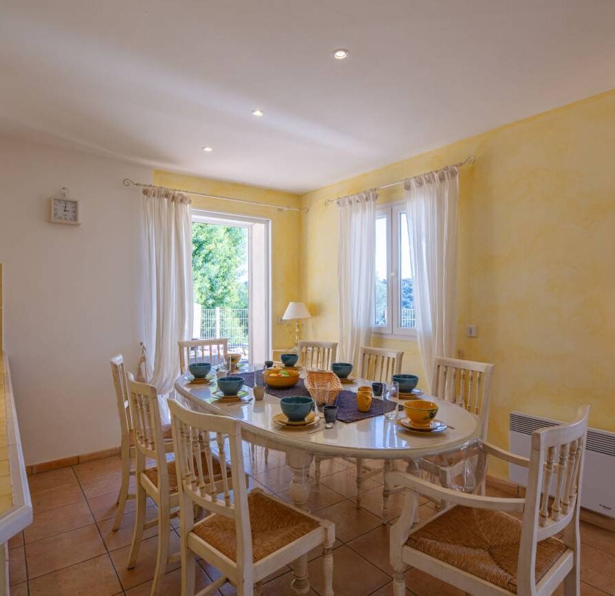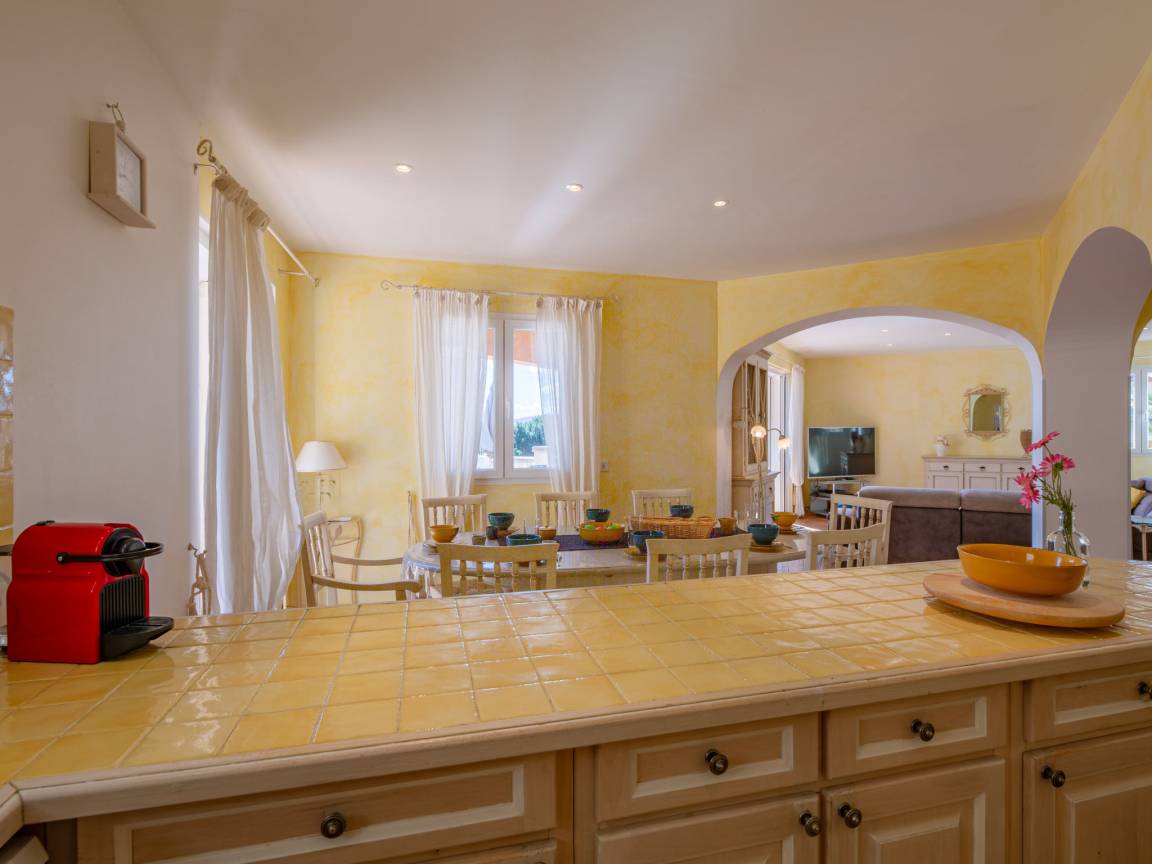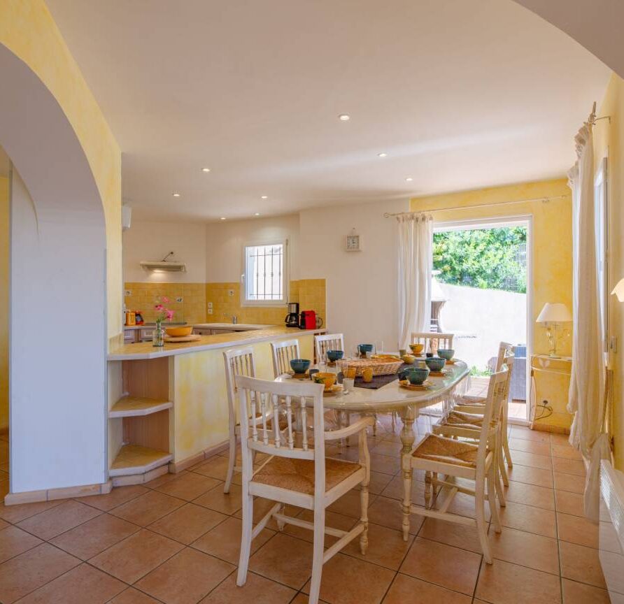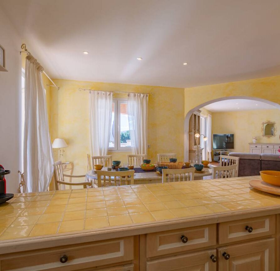 Le séjour, lumineux et agréable à vivre, donne sur la terrasse et la piscine. On passe facilement d’un moment à l’intérieur à un déjeuner dehors, sans rupture. La cuisine ouverte, entièrement équipée, permet de cuisiner simplement, comme à la maison.