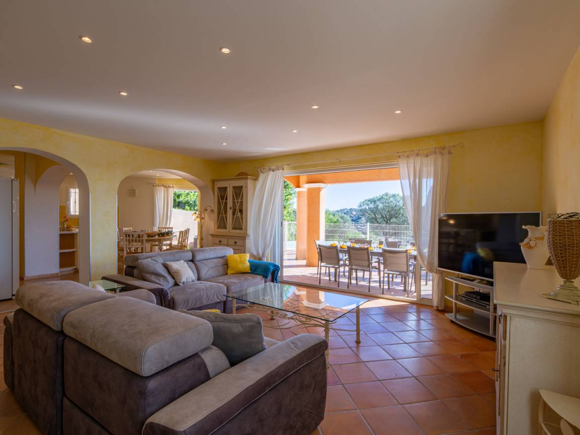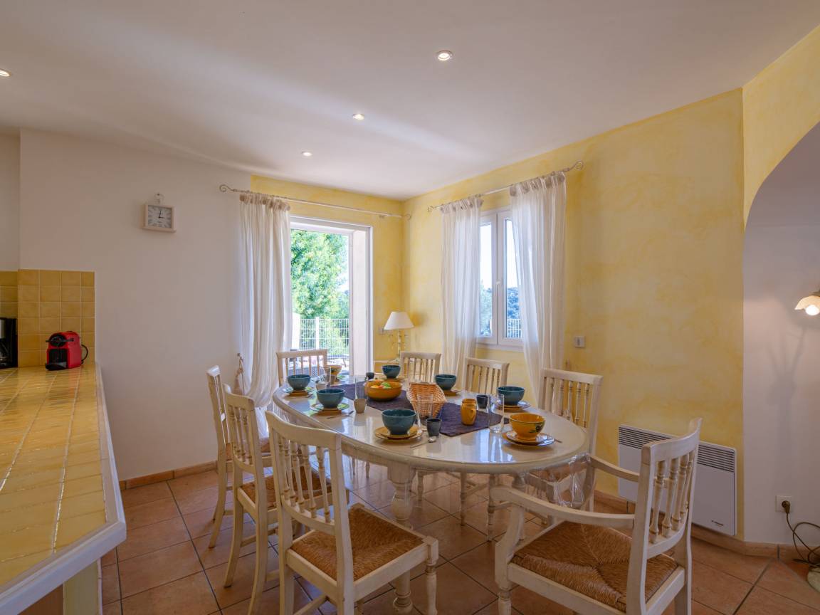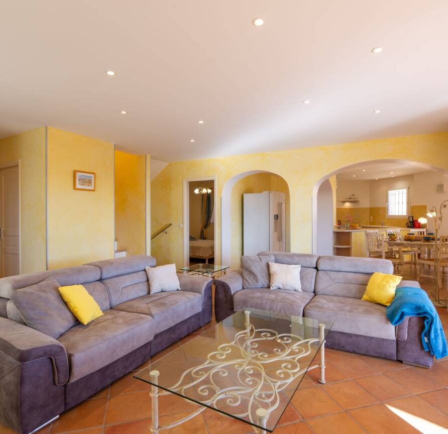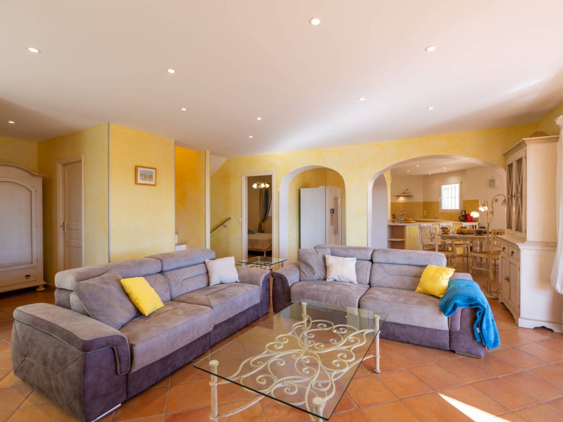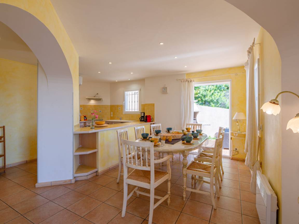 Le séjour, lumineux et agréable à vivre, donne sur la terrasse et la piscine. On passe facilement d’un moment à l’intérieur à un déjeuner dehors, sans rupture. La cuisine ouverte, entièrement équipée, permet de cuisiner simplement, comme à la maison.